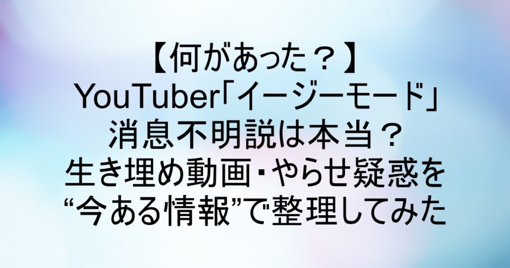 こんにちは、あゆりんです。 最近、「イージーモード(ユーチューバー)」「何があった」「やらせ」みたいな検索ワードが目立っていて、SNSでもざわついてますよね。 中でも目にするのが、 “生き埋めにされたっぽい動画が一瞬上がった” “すぐ消えた” “それ... -