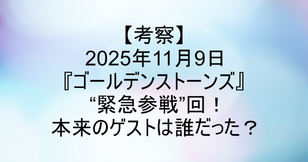 【考察】2025年11月9日『ゴールデンストーンズ』“緊急参戦”回!本来のゲストは誰だった?なぜ藤森慎吾・劇団ひとり・ザキヤマの3人?