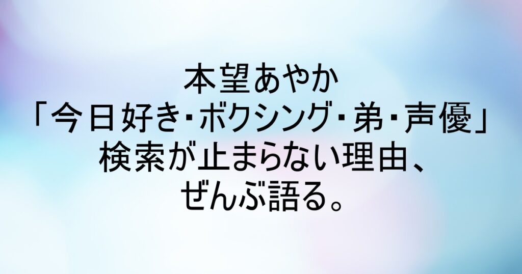 こんにちは、あゆりんです。 最近、SNSでもニュースサイトでも「本望あやか」って名前、よく見かけませんか? しかも一緒に出てくるのが「今日好き」「ボクシング」「弟」「声優」。 「なにこれ、どういう組み合わせ!? 」と気になって調べた人、多いと思い... -